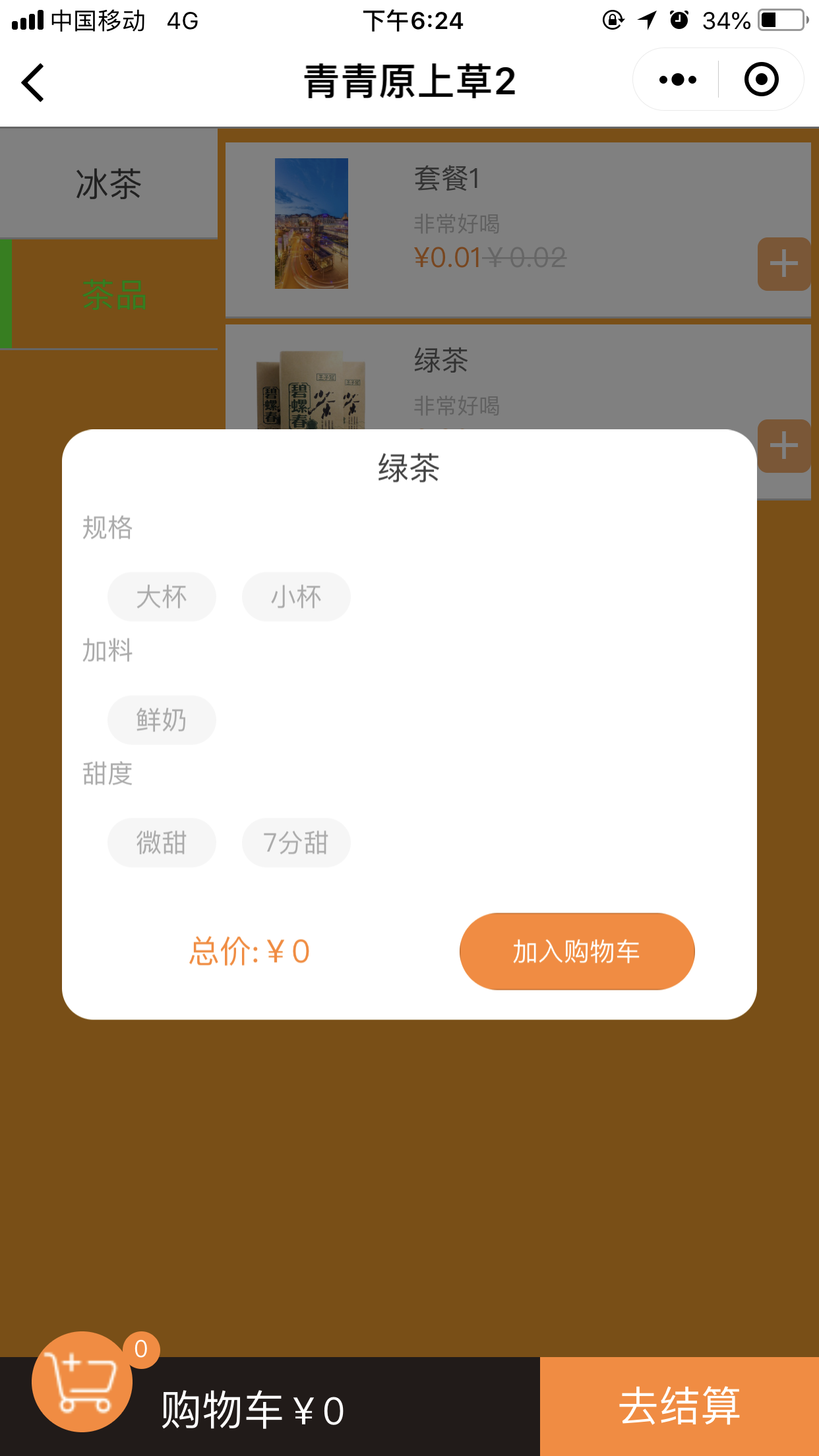 4.在前台,用户点击“开始点单”可以根据位置匹配到最近的店面,并且可以选择取餐的方式“立即取餐”或“稍晚取餐”,进入点单列表页我们添加菜品时,可以选择我们在后台添加的“配料”、“口味”、以及“规格”等,选择完毕之后,点击“去结算”跳转到提交订单页面,取单时间根据用户的选择会显示为“立即取单”或者为“取单的时间点”,提交订单后,会跳转到“订单详情”页面,当商家在后台点击“接单”接单后,会有“取餐码”显示出来,如图所示: