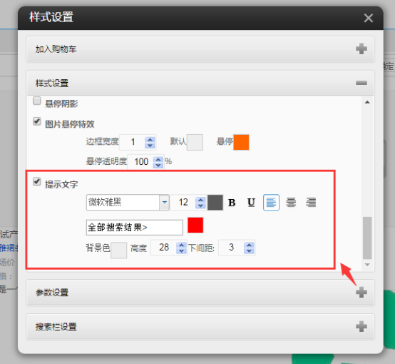 ⑦.点击结果插件的样式设置,可以设置样式。和产品列表一样,可以选择加入购物车等