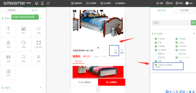 1. 在小程序编辑器-产品详情中,点击“属性设置”选择“分享”,则可将该商品制作为海报进行分享,客户扫码后即可进入到该商品的产品详情页中,如图所示:
